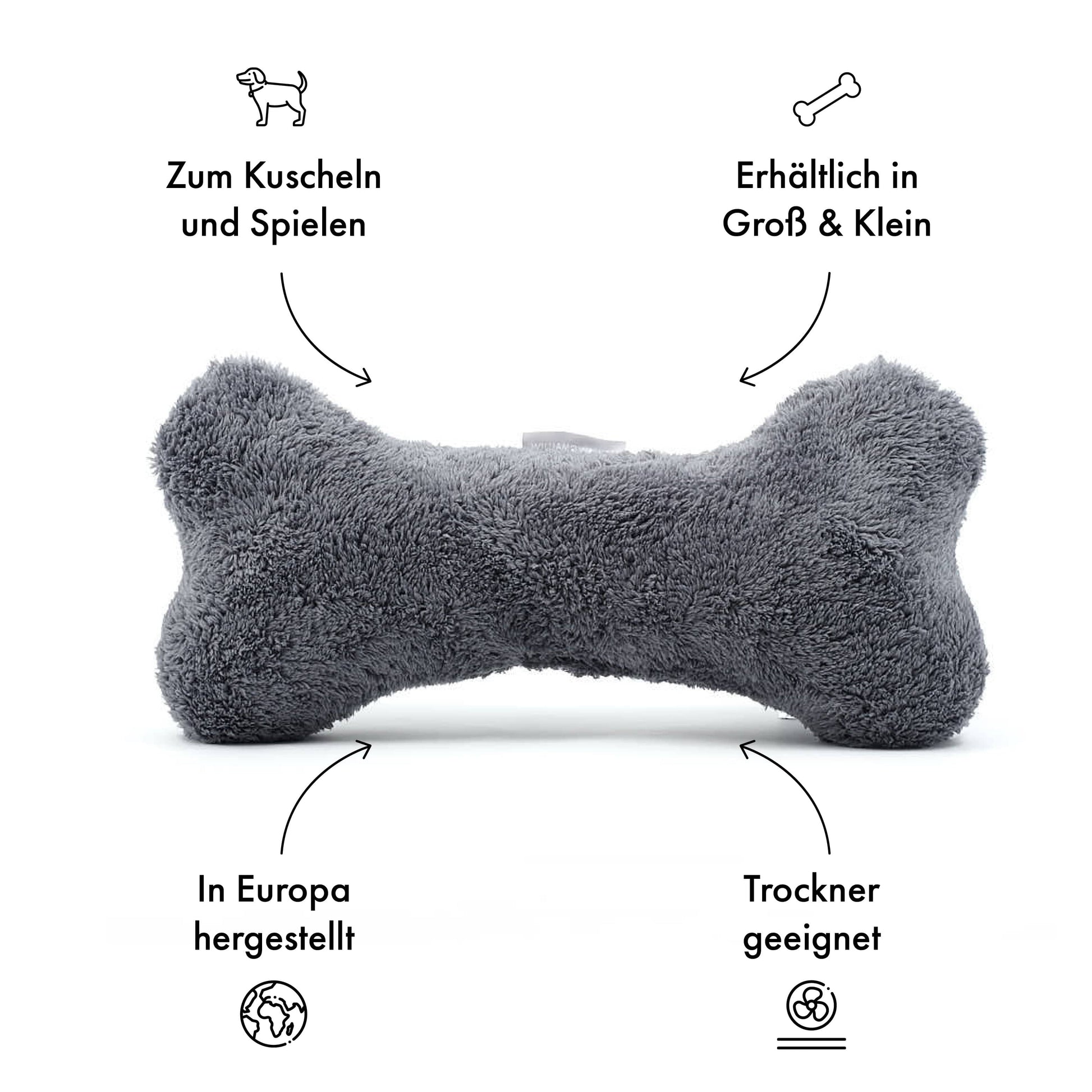 Hoogwaardig stoffen bot van donkergrijs pluche - stijlvol speelgoed zonder piepgeluiden. Zachte vulling voor knuffel- en werpplezier.
