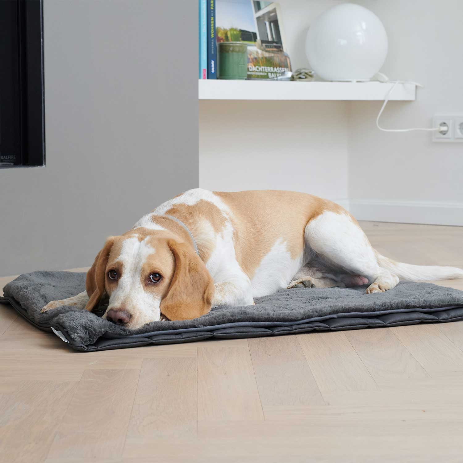 Hoogwaardige grijze reismat met uitneembare extra vachtlaag. Beschermt tegen vocht en kou. Makkelijk te vervoeren dankzij de praktische draaggreep.